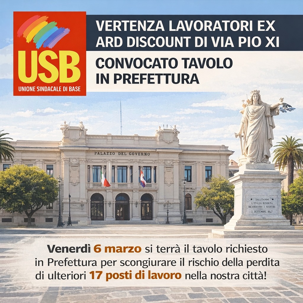 È stato convocato per domani, venerdì 6 marzo, il tavolo in Prefettura richiesto nei giorni scorsi dall’USB per affrontare la situazione dei lavoratori dell’ex punto vendita ARD Discount di via Pio XI. Al confronto, oltre alla nostra organizzazione sindacale, sono state invitate a partecipare anche le aziende interessate, Gicap e Iracarni, insieme all’Ispettorato del Lavoro, all’INPS e al Sindaco di Reggio Calabria.